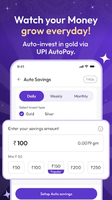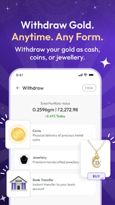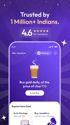 Aura Gold செயலி ஒரு எளிமையான பயனர் இடைமுகத்தைக் கொண்டுள்ளது, இது பாதுகாப்பான மற்றும் தொந்தரவு இல்லாத பரிவர்த்தனைகளை உறுதி செய்கிறது. ஒரு 10 இலக்க மொபைல் எண் மூலம் விரைவாகப் பதிவுசெய்து, OTP சரிபார்ப்புக்குப் பிறகு உடனடியாக உங்கள் கணக்கைத் தொடங்கலாம். உங்கள் தங்க சேமிப்பின் மதிப்பையும் லாபத்தையும் நிகழ்நேரத்தில் உங்கள் டாஷ்போர்டில் கண்காணிக்கலாம். Aura Gold, தங்கம் வாங்குவதற்கோ விற்பதற்கோ எந்த ஒரு பரிவர்த்தனை கட்டணத்தையும் வசூலிப்பதில்லை. அதிக மதிப்புள்ள கொள்முதல்கள், தங்கத்தை விற்பது அல்லது வீட்டுக்கே விநியோகம் பெறுவது போன்ற சில சந்தர்ப்பங்களில் மட்டுமே PAN அட்டை விவரங்கள் தேவைப்படும், இதுவும் உங்கள் பாதுகாப்பை உறுதி செய்வதற்காகவே. சிறிய அளவிலான தங்க முதலீடுகளுக்கு ஆதார் அட்டை விவரங்கள் போதுமானவை.