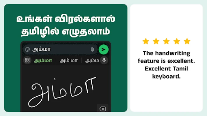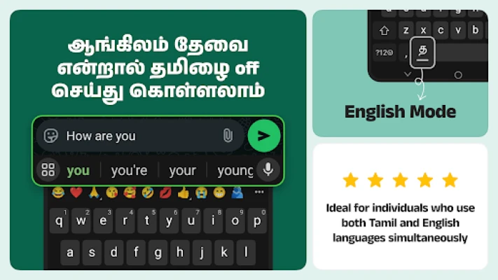 உங்கள் அன்றாட உரையாடல்களை அழகாகவும், வேகமாகவும், எளிமையாகவும் மாற்றும் ஒரு புதிய சகாப்தத்திற்கு Desh Tamil Keyboard உங்களை வரவேற்கிறது! ஆங்கிலத்தில் டைப் செய்து உடனடியாக அழகான தமிழ்ச் சொற்களைப் பெற Tanglish முறை உதவுகிறது. குரல்வழித் தட்டச்சு மூலம் கைகள் இல்லாமலே பேசிக்கொண்டே எழுதலாம். மேலும், கைப்பட எழுதும் வசதி அல்லது எழுத்து வாரியாகத் தேர்வு செய்யும் முறை என உங்கள் விருப்பத்திற்கேற்ப எந்த முறையிலும் தமிழை உள்ளீடு செய்யலாம். தமிழ் தேவையில்லையா? ஒரு தட்டலில் ஆங்கிலத்திற்கு மாறி, எந்தத் தடையுமின்றி உங்கள் வேலையைத் தொடரலாம். Desh Tamil Keyboard மூலம் தட்டச்சு அனுபவம், முன்னெப்போதையும் விட சிறப்பாகவும் துல்லியமாகவும் இருக்கும்.