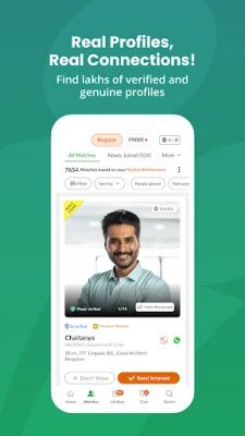 இந்தியா முழுவதிலுமிருந்து தினசரி ஆயிரக்கணக்கான கன்னடர்கள் கன்னட மேட்ரிமோனி இல் தங்கள் சுயவிவரங்களைப் பதிவுசெய்து, லட்சக்கணக்கான துணைகளைத் தேடி வருகின்றனர். எங்கள் தளத்தில் சுயவிவரத்தை உருவாக்குவது மிகவும் எளிது. MIMA™ என்ற எங்களது மேம்பட்ட AI தொழில்நுட்பம், உங்கள் எதிர்பார்ப்புகளுக்கு ஏற்ற துணைகளைத் துல்லியமாகப் பரிந்துரைக்கிறது. புதிய பொருத்தங்கள், சுயவிவரத்தில் ஆர்வம் காட்டுவோர் அல்லது பதில் அளிப்பவர்கள் குறித்து உங்கள் மொபைலில் உடனடியாக அறிவிப்புகள் கிடைக்கும். நகரம், கல்வி, பணி மற்றும் பல அம்சங்களின் அடிப்படையில் நீங்கள் விரும்பும் துணையை எங்கள் பிரத்யேக வடிகட்டித் தேர்வுகள் மூலம் எளிதாகக் கண்டறியலாம். பிரீமியம் உறுப்பினர் மூலம் பாதுகாப்பான அரட்டை மற்றும் குரல் அழைப்பு வசதிகள், சரிபார்க்கப்பட்ட 'கன்னட மேட்ரிமோனி பிரைம்' சுயவிவரங்களுக்கான அணுகல் மற்றும் உங்கள் சுயவிவரத்தை முன்னிலைப்படுத்தி அதிக பதில்களைப் பெறும் வாய்ப்பு போன்ற கூடுதல் நன்மைகளை அனுபவிக்கலாம். இருப்பிடம், கல்வி மற்றும் ஜாதகம் போன்ற முழுமையான சுயவிவர விவரங்களை நீங்கள் காணலாம்.