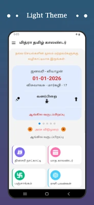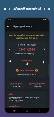 Mithra Apps குழுமம் வழங்கும் இந்தச் செயலி, உங்கள் அன்றாட வாழ்வின் ஆன்மீக மற்றும் நடைமுறைத் தேவைகளைப் பூர்த்தி செய்யும் வகையில் ஒரு முழுமையான தமிழ் நாட்காட்டியாக வடிவமைக்கப்பட்டுள்ளது. ஒவ்வொரு நாளின் பஞ்சாங்கம், நல்ல நேரம், ராகு காலம், யமகண்டம், குளிகை, கௌரி நல்ல நேரம், அடிப்படை ராசி பலன், சந்திராஷ்டமம், திதி, நட்சத்திரம், கரணம் போன்ற துல்லியமான தகவல்களை ஒரே இடத்தில் வழங்கும் இந்தச் செயலி, உங்கள் தினசரி திட்டமிடலுக்கும் ஆன்மீகத் தேடலுக்கும் உறுதுணையாக அமையும். இது நாளாந்த மற்றும் மாதாந்திர காலண்டர் பார்வைகளைக் கொண்டு, நீங்கள் தேடும் எந்தத் தகவலையும் எளிதில் கண்டறிய உதவுகிறது.