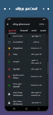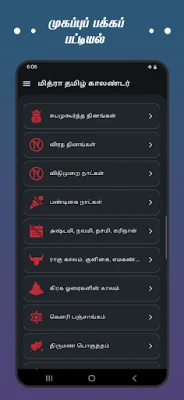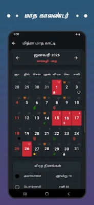 மாதாந்திர காலண்டர் பிரிவில், தமிழ் தேதிகள், பல்வேறு விரத தினங்கள், சுப முஹூர்த்த நாட்கள், திருநாள்கள் மற்றும் அரசு விடுமுறை நாட்கள் என அனைத்தும் எளிமையாகக் காணலாம். இந்து, கிறிஸ்தவ, இஸ்லாம் ஆகிய மதங்களின் பண்டிகைகள் வகைப்படுத்தப்பட்டு, பயனாளர்களுக்குத் தெளிவான பார்வையை அளிக்கிறது. மேலும், இந்தச் செயலியின் தனிச்சிறப்பு அம்சமாக, 12 ராசிகளுக்கான அடிப்படை நட்சத்திரப் பொருத்தம் திருமணத்திற்கு ஏற்ற வகையில் வழங்கப்பட்டுள்ளது. அஷ்டமி, நவமி, தசமி, கரி நாட்கள், கௌரி பஞ்சாங்கம், கோரை காலம், தனிஷ்ட பஞ்சமி, வாஸ்து சாஸ்திரக் குறிப்புகள் எனப் பல அரிய தகவல்களும் இதில் உள்ளடக்கப்பட்டுள்ளன, பயனர்களுக்கு ஒரு முழுமையான அனுபவத்தை வழங்குகிறது. இதன் மென்மையான மற்றும் விரைவான பயனர் இடைமுகம், பயன்பாட்டைச் சுலபமாக்குகிறது.